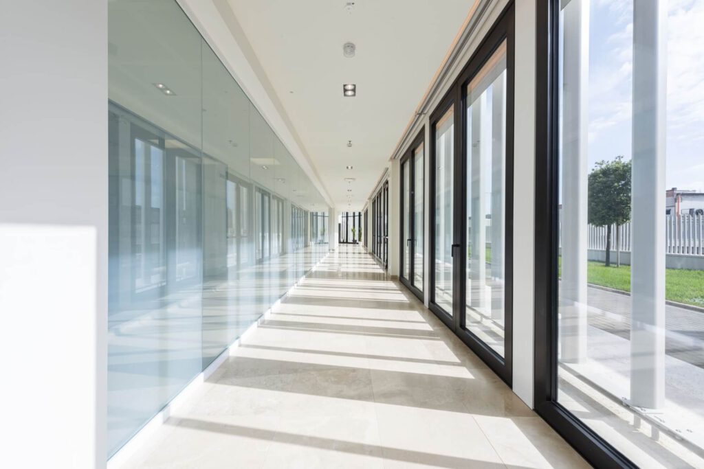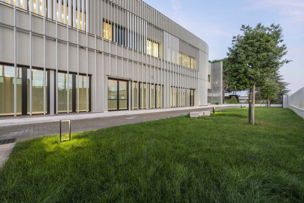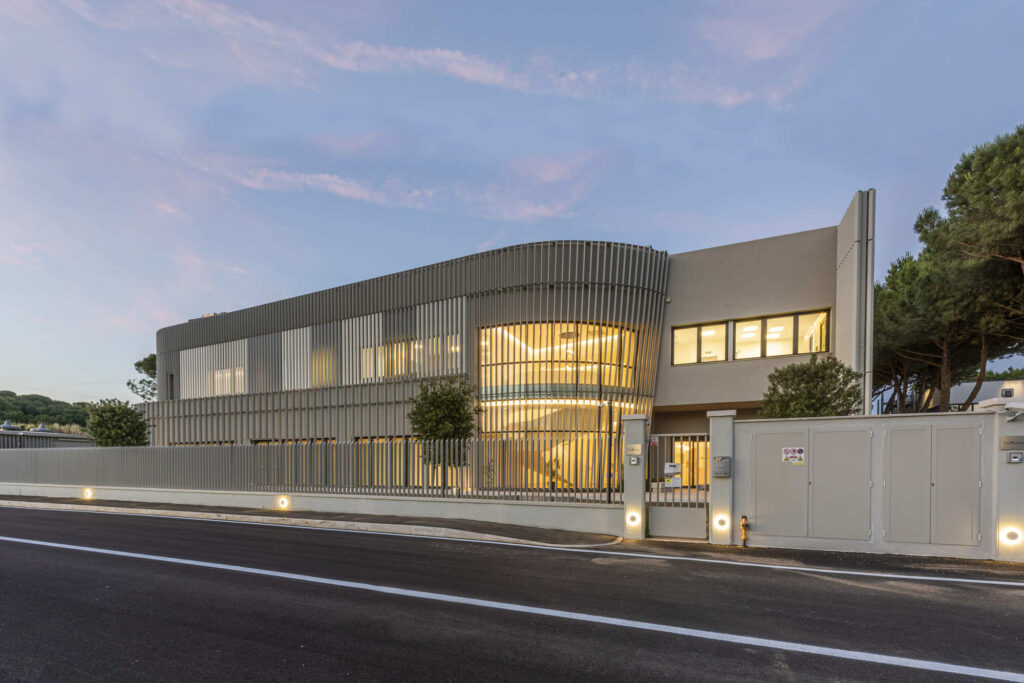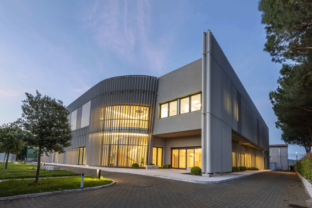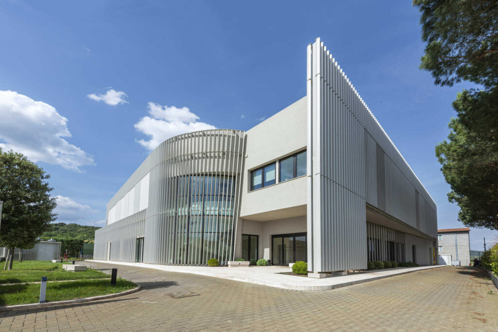 L'edificio proposto ha destinazione produttiva e si inserisce nel paesaggio collinare delle crete senesi. Si configura come un volume unico con copertura piana praticabile, costituito da due piani che ruotano l'uno rispetto all'altro e i cui angoli, più o meno smussati, diventano motivo architettonico e progettuale, derivante dall’andamento del canale che lo lambisce. L'intera superficie verticale è avvolta da una parete frangisole costituita da elementi verticali in alluminio dalla sezione cava romboidale, alle volte fissi altre orientabili, distanziati tra loro con passo variabile a seconda della destinazione del vano immediatamente adiacente e della posizione che questi assumono in termini di irraggiamento. Particolare attenzione è stata inoltre rivolta all'integrazione delle strutture impiantistiche necessarie allo svolgimento dell'attività con il contesto, attraverso l'inserimento sia puntuale e che continuo di elementi vegetativi sia nell'area di pertinenza esterna, che integrati nell'edificio, in copertura e lungo le facciate.